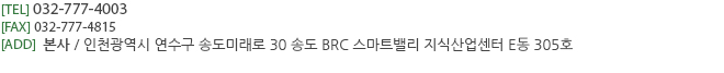 상호명 웰루트 | 대표자 김기훈 | 사업자등록번호 131-33-84976 | TEL 032-777-4003 | FAX 032-777-4815 | ADD 인천광역시 연수구 송도미래로 30 송도 BRC 스마트밸리 지식산업센터 E동 305호
